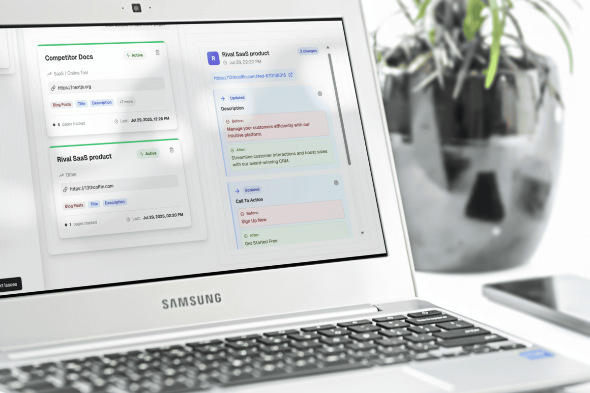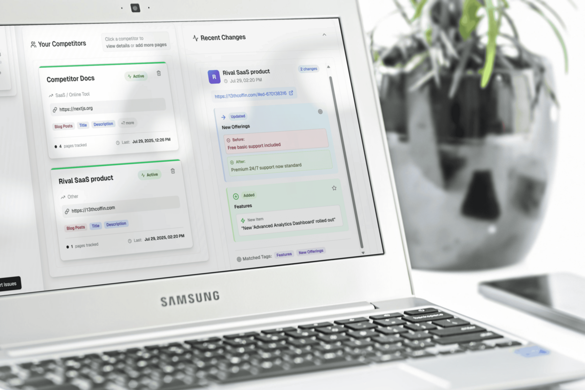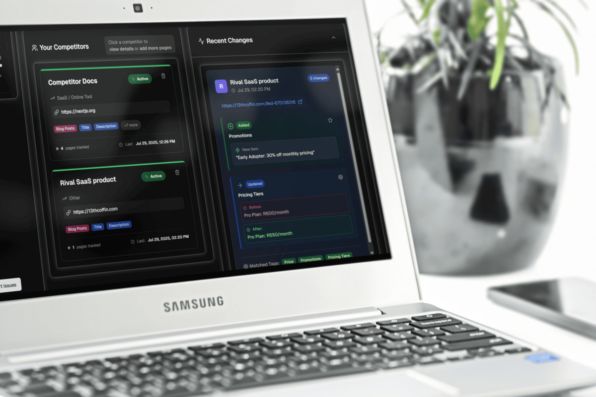 A competitive intelligence tool that monitors your competitor's website for changes in products, services, pricing, and content. It delivers clear, timely summaries so you can react decisively and make informed decisions to help scale up your business in its dedicated market sector.